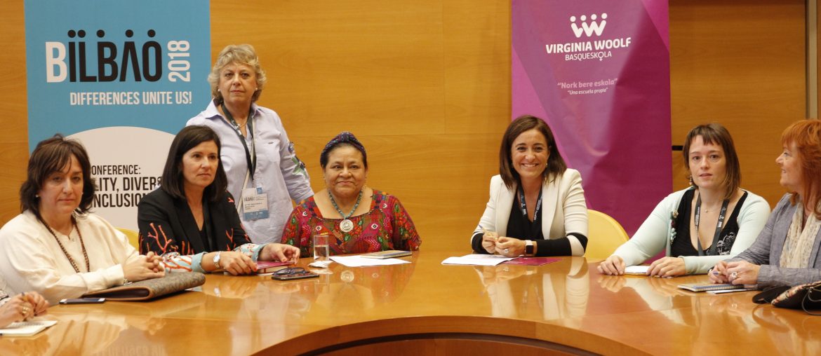 Bilbo, 2018ko ekainaren 12an. Gaur goizean, Europako Udal eta Eskualdeen Kontseiluaren (CMRE) “Bilbo-2018 Berdintasuna, Aniztasuna eta Inklusioa” Konferentzia barruan, Nobel Saridun eta konferentziaren gonbidatua den Rigoberta Menchuren eta Virginia Woolf Basqueskola euskal emakume hautetsien arteko solasaldi bat antolatu da.