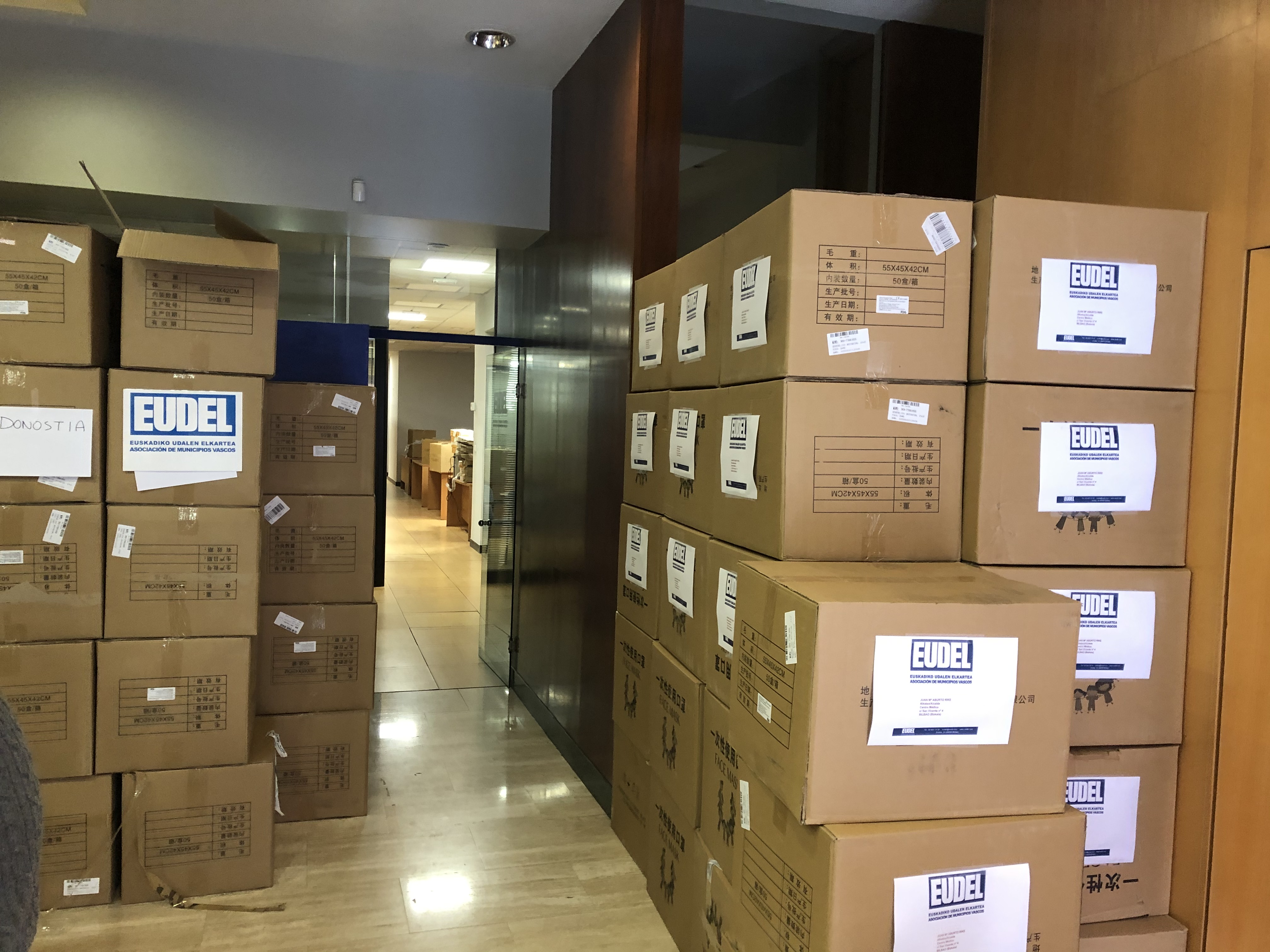 Bilbon, 2020ko apirilaren 22an. EUDEL – Euskadiko Udalen Elkarteak 300.000 maskara kirurgikoko partida bat erosteko ekimena izan du, EAEko udal guztiei ohiz kanpoko dohaintza zehatz bat egiteko, horrela, osasun-larrialdian lagundu, eta birusaren aurkako babes-ekipoen hornidura indartzeko. Udal-gobernu bakoitzak erabakiko du, tokiko autonomiaren bidez, arnas babesgarriak norentzat izango diren.