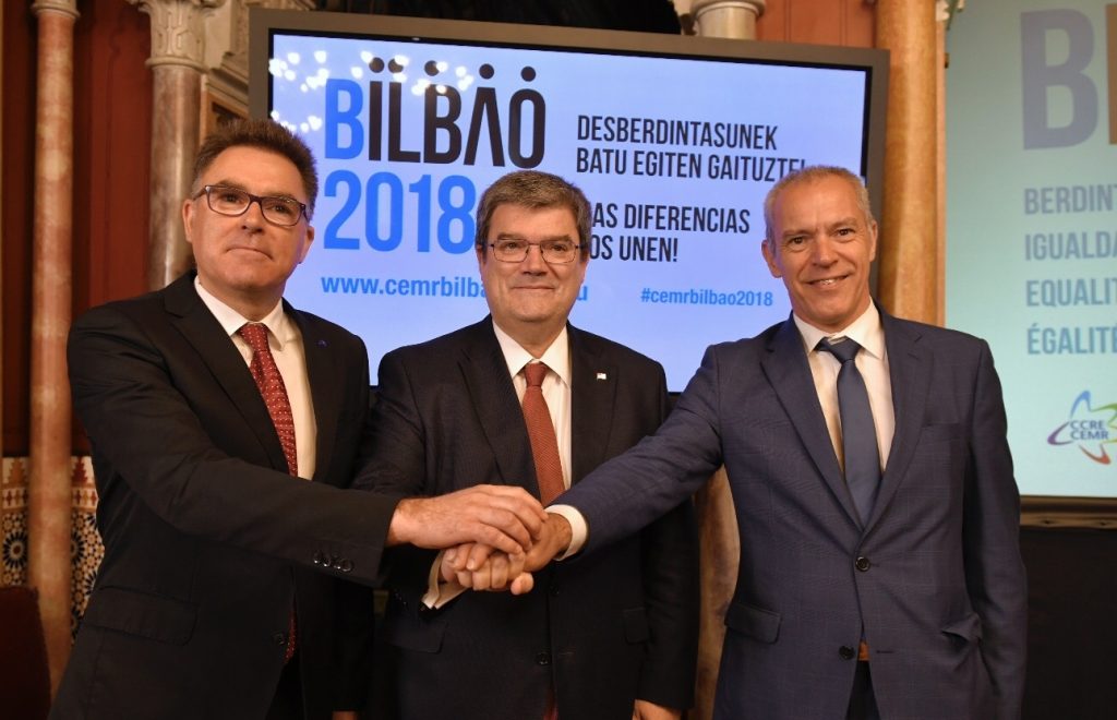 Bilbon, 2018ko ekainaren 1ean. Juan Mari Aburto Bilboko alkateak, Imanol Landa EUDELeko elkarteburuak eta Frédéric Vallier CMREko idazkari nagusiak, hau da, hiru antolatzaileek, Europako udalerrien eta eskualdeen hurrengo konferentziaren saioen programa eta helburuak aurkeztu dituzte gaur goizean, udaletxeko Areto Arabiarrean. Konferentzia Bilboko Euskalduna Jauregian egingo da ekainaren 11tik 13ra, eta“Berdintasuna, Aniztasuna eta Inklusioa. Desberdintasunek batzen gaituzte!” izango du izenburu.