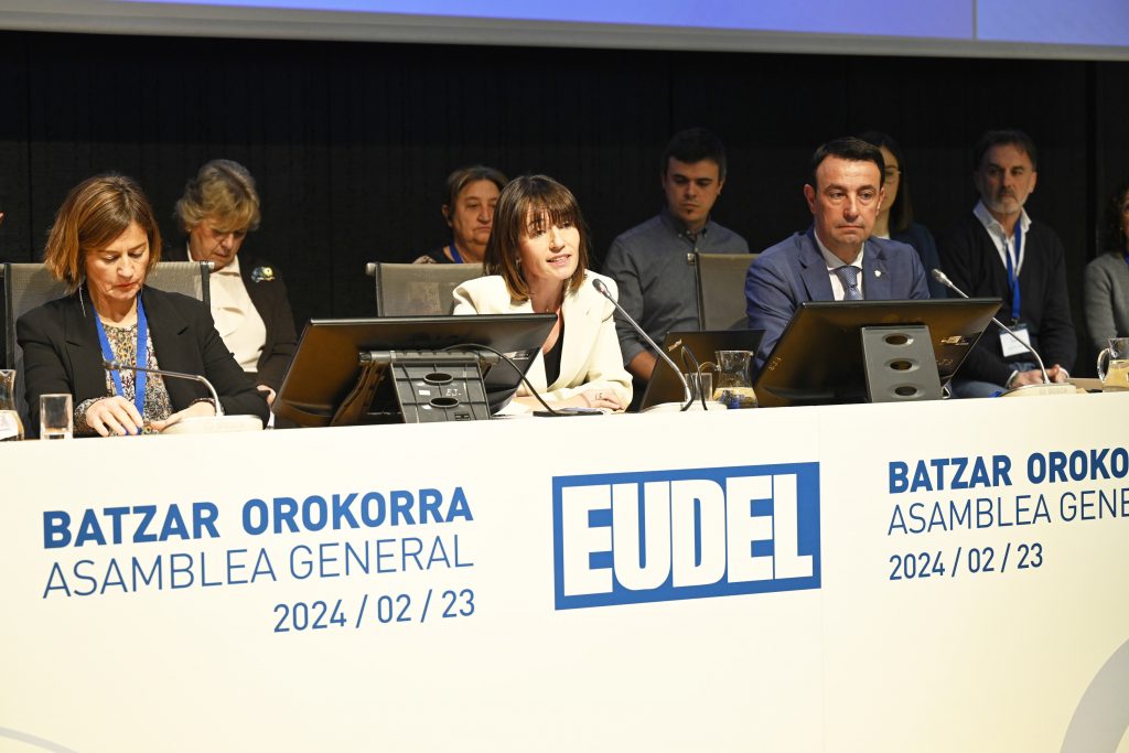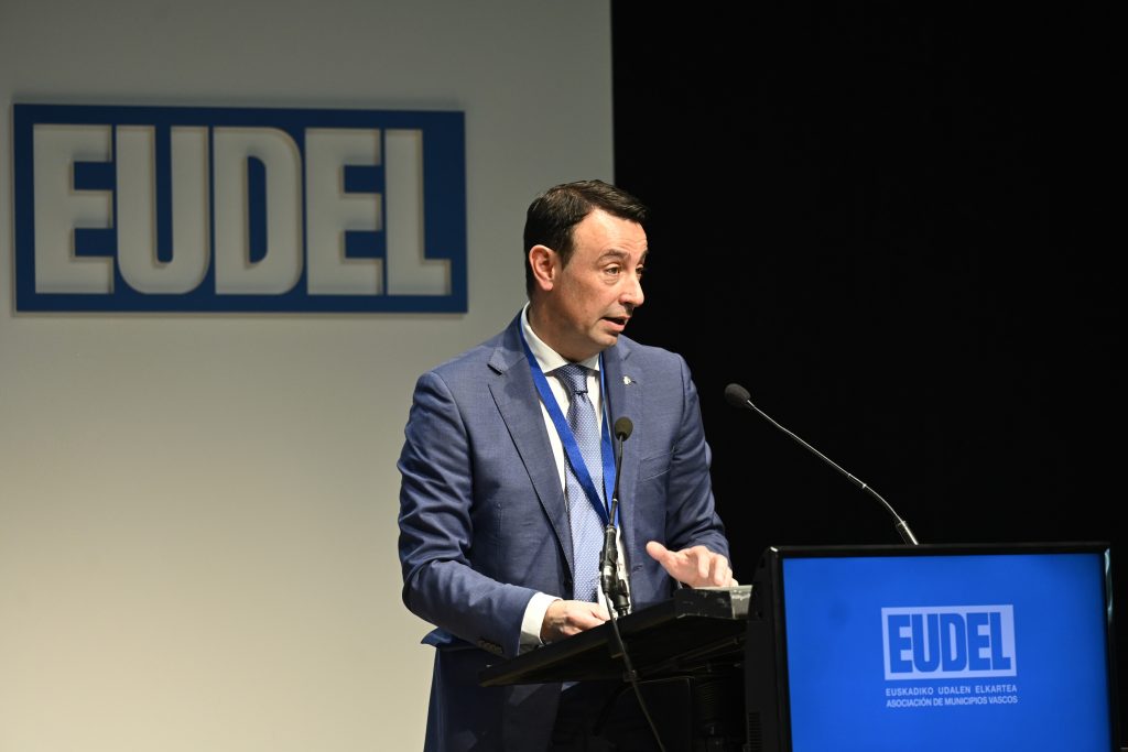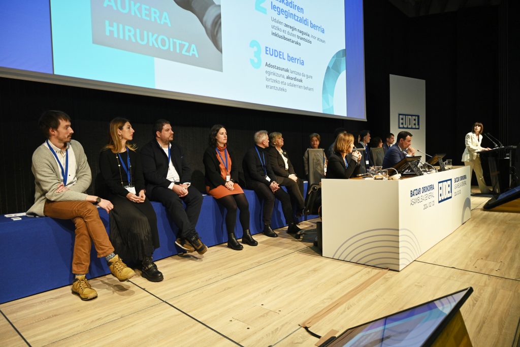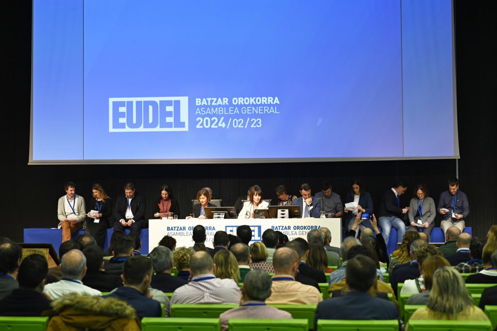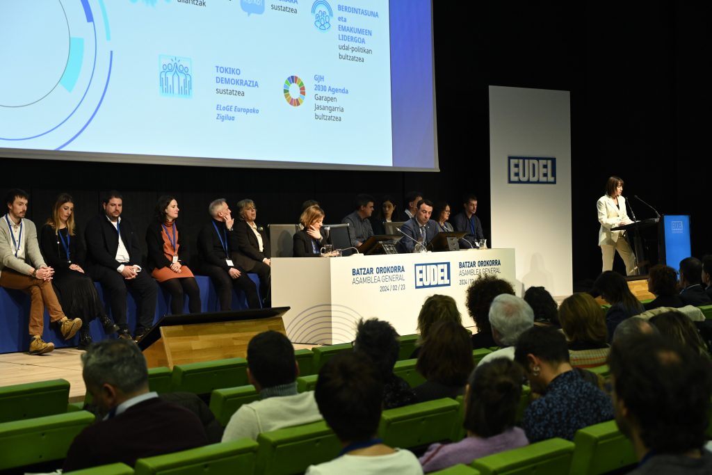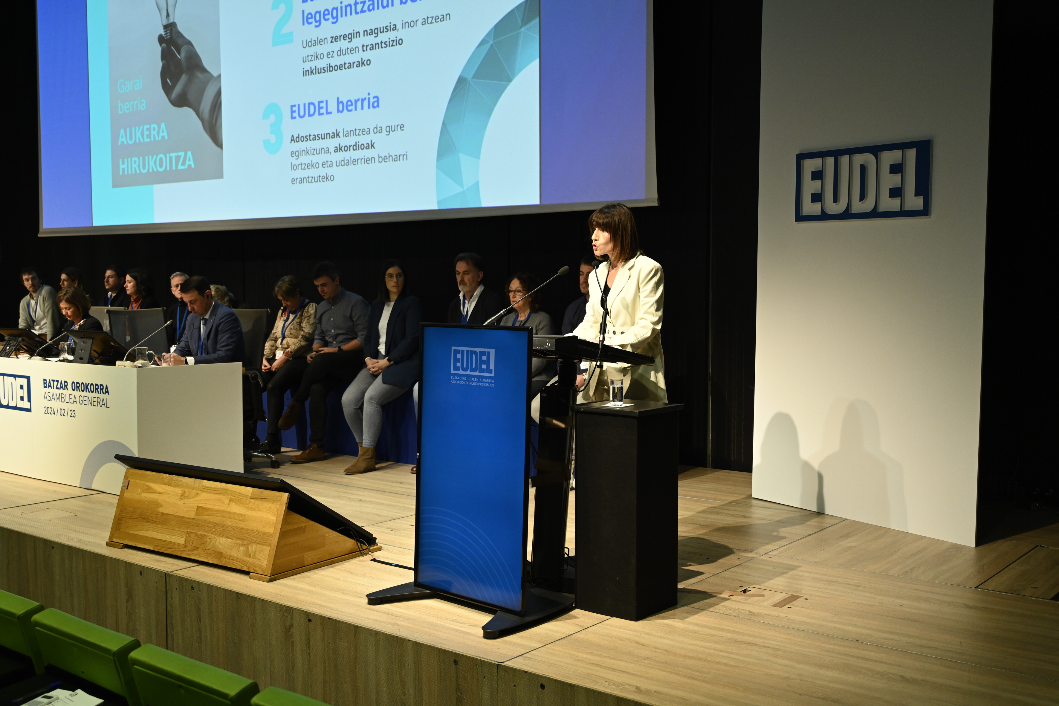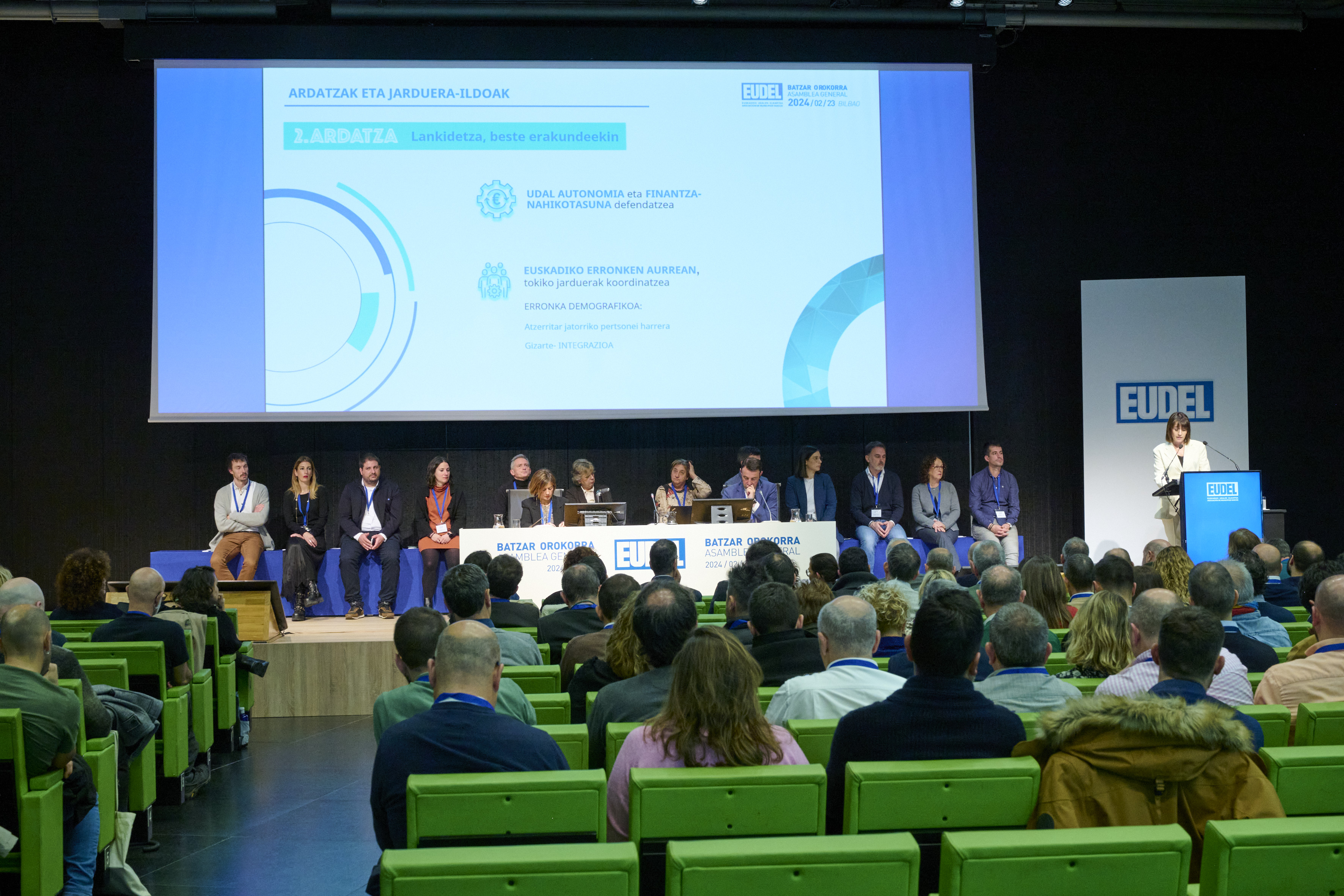 Batzarreko bere hitzaldian, EUDELeko elkarteburuak “tokiko lidergoa” euskal gizartearen zerbitzura jartzeko deia egin die euskal udalei, “erakundeen lankidetzatik, transakzio handietan, sozial-demografiko, digital, ekologiko eta feministetan laguntzeko”.