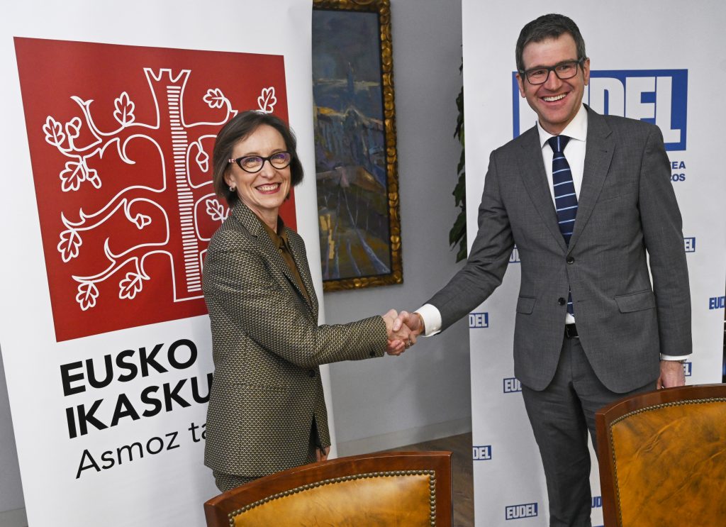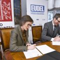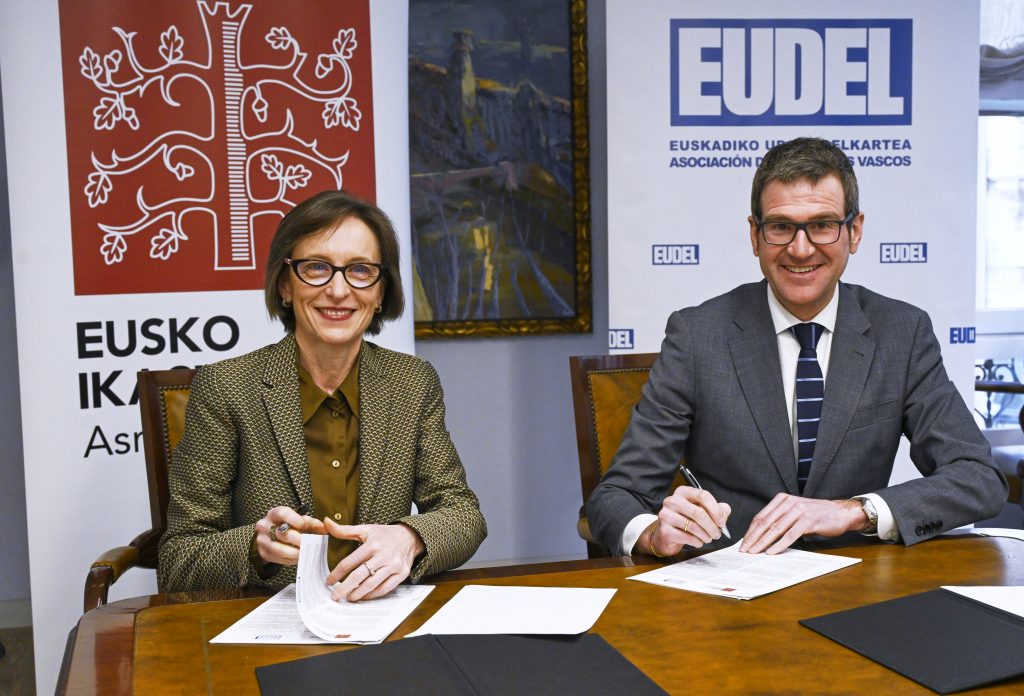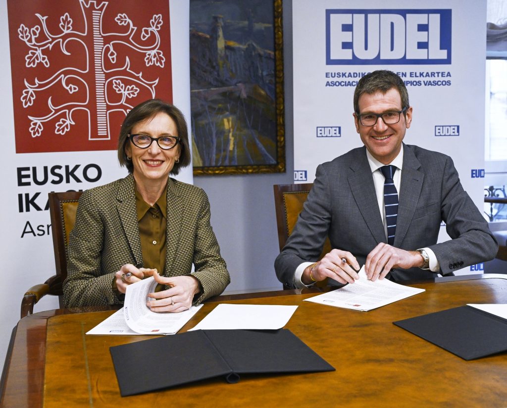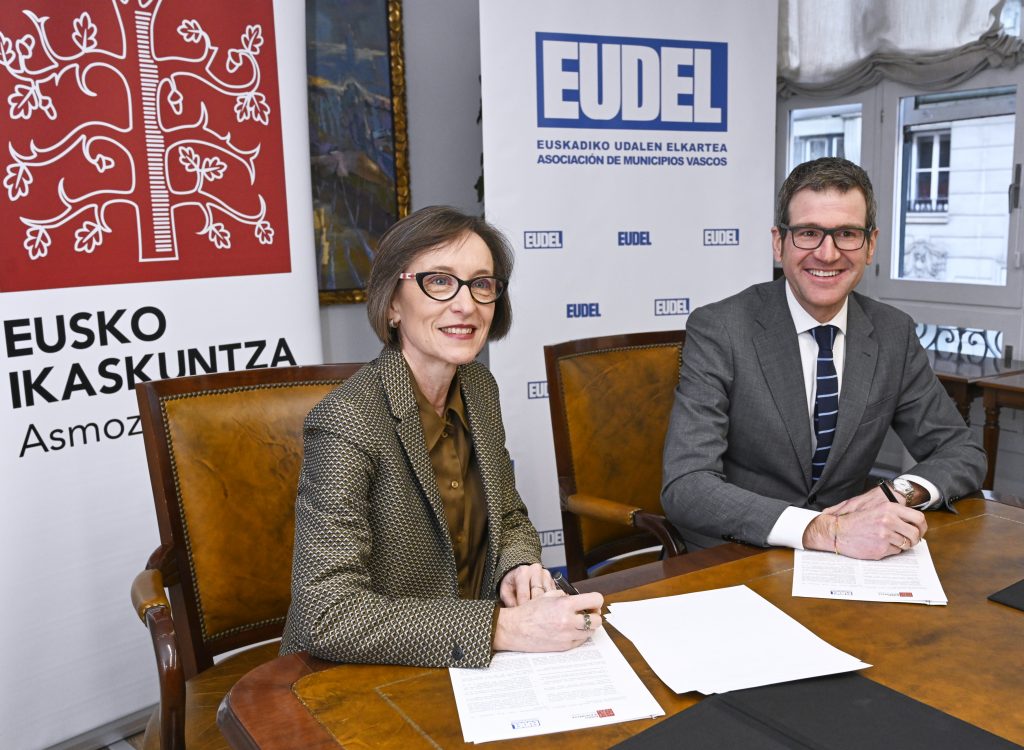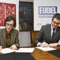 Bilbon, 2023ko otsailaren 9an. Gorka Urtaranek, Euskadiko Udalen Elkartea-EUDELeko elkarteburuak, eta Ana Urkizak, Eusko Ikaskuntzako lehendakariak, elkarrekiko lehen lankidetza-hitzarmena sinatu dute gaur. Hitzarmen horren bidez, bi erakundeek proiektuak partekatuko dituzte, ingurune hurbilenetik, udalerrietatik eta tokiko komunitateetatik, euskal gizartea murgilduta dagoen trantsizioei heltzeko.