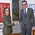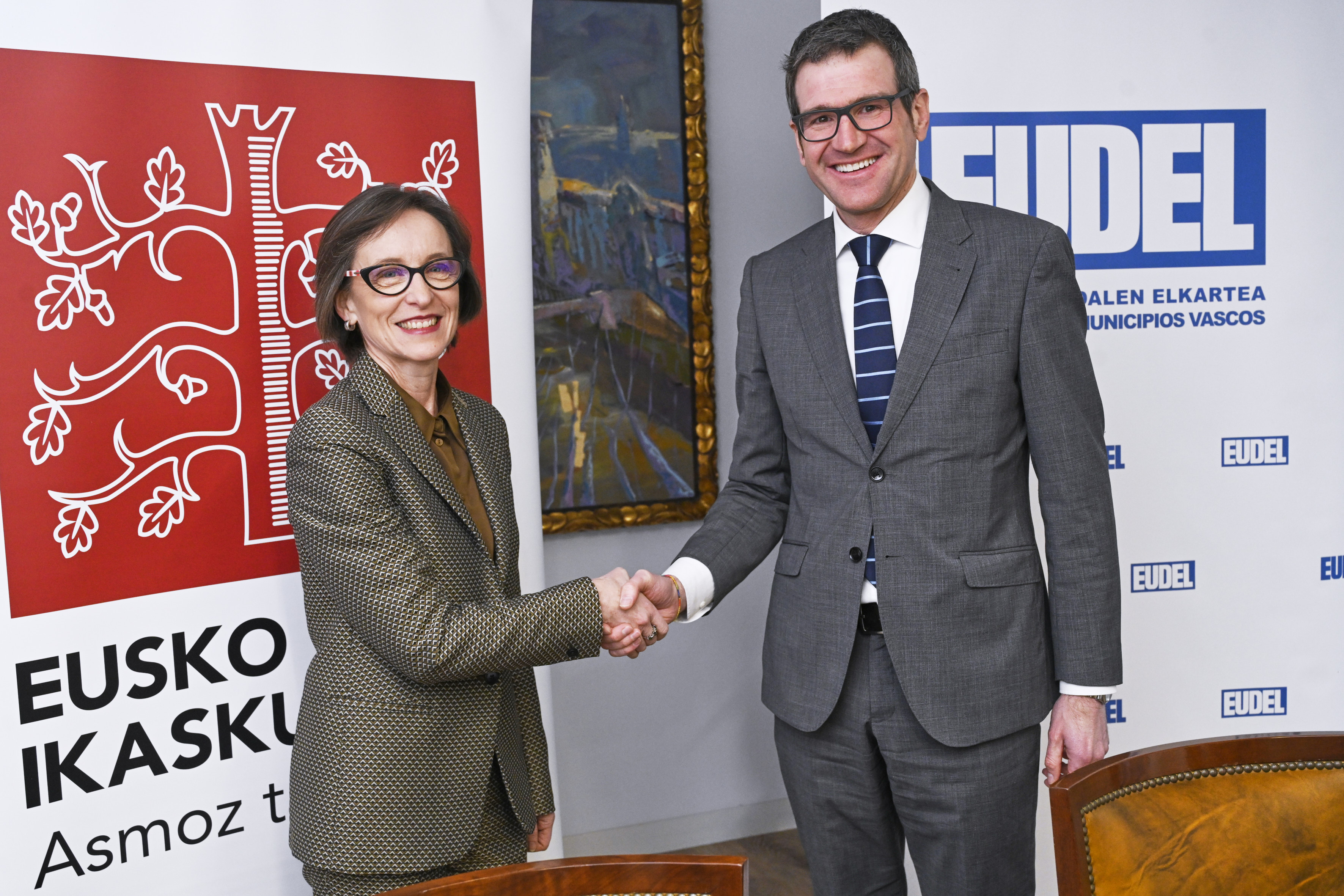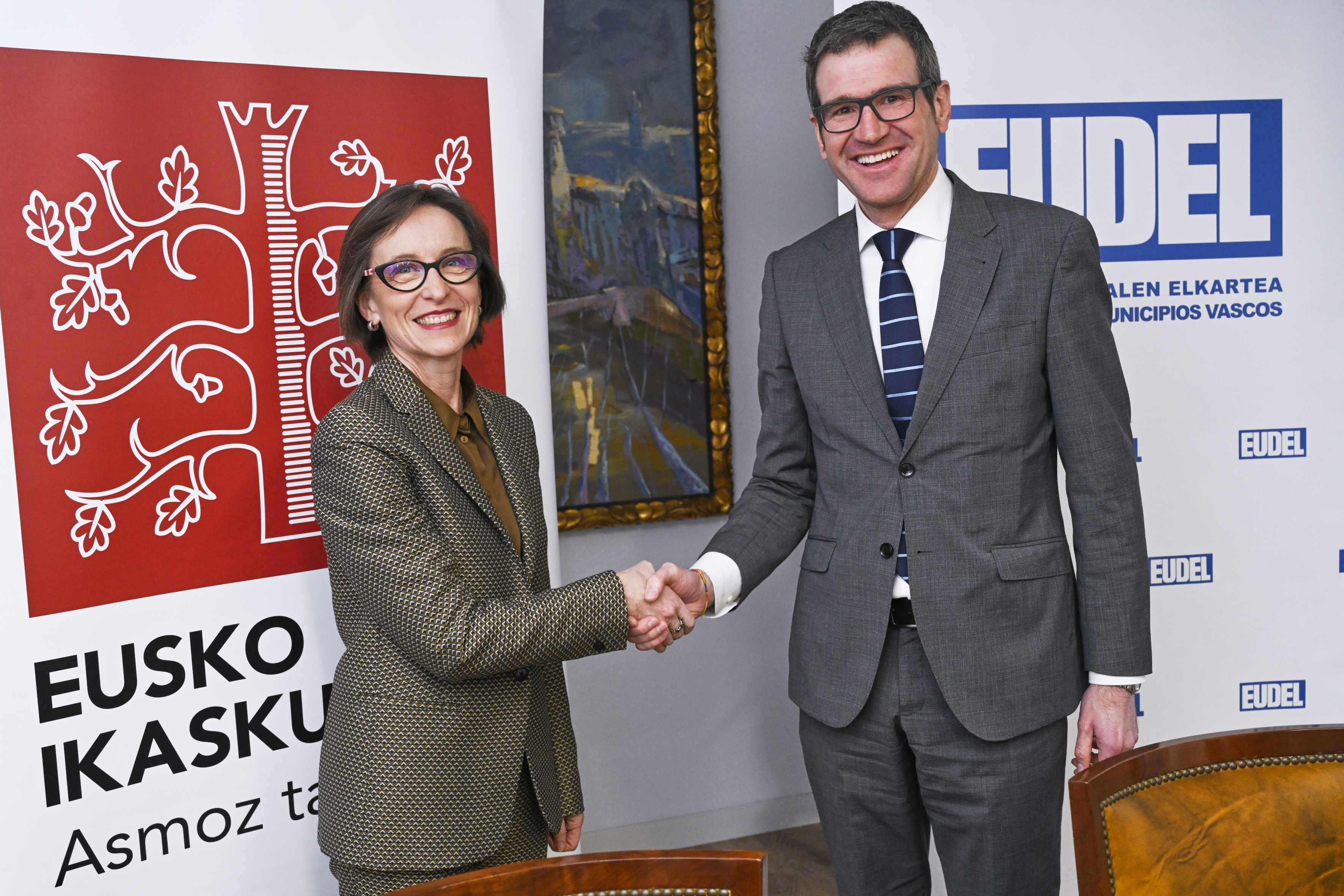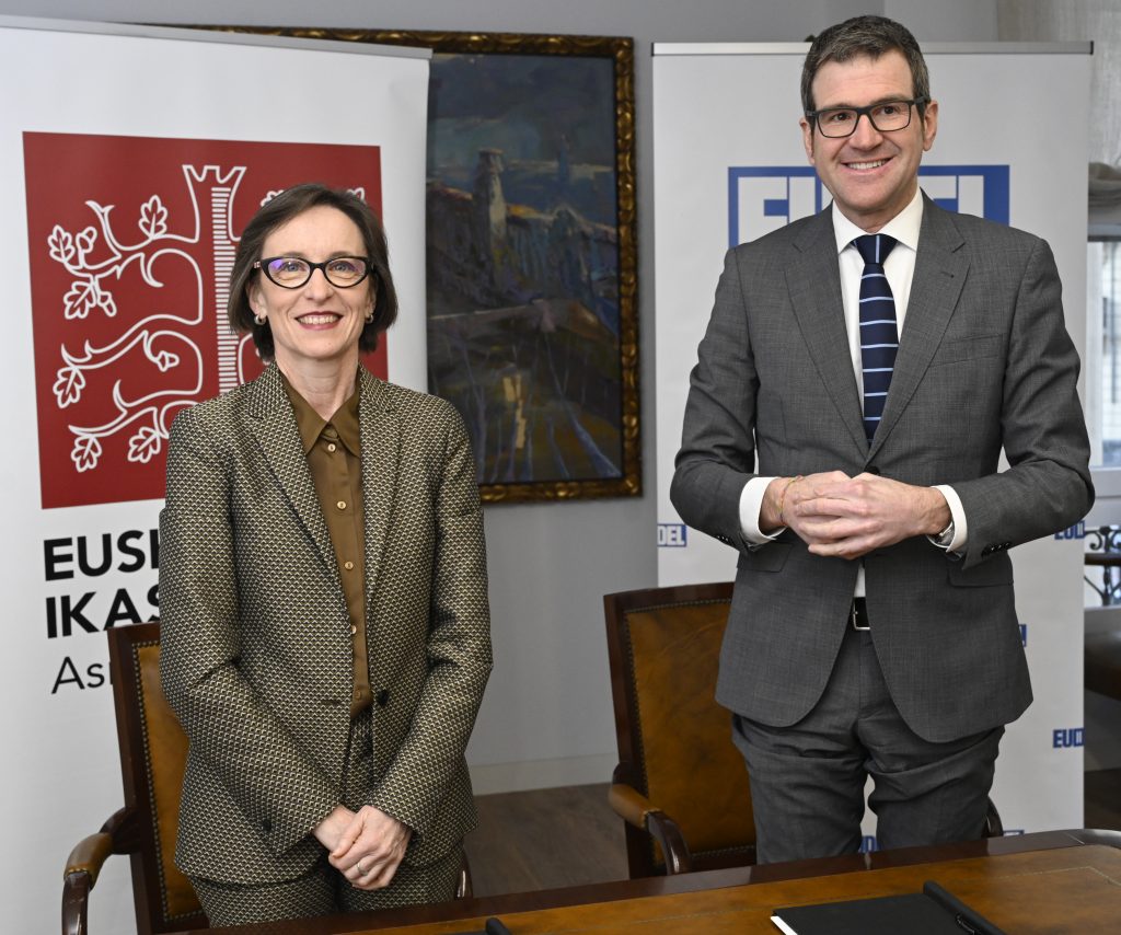 Bilbon, 2023ko otsailaren 9an. Gorka Urtaranek, Euskadiko Udalen Elkartea-EUDELeko elkarteburuak, eta Ana Urkizak, Eusko Ikaskuntzako lehendakariak, elkarrekiko lehen lankidetza-hitzarmena sinatu dute gaur. Hitzarmen horren bidez, bi erakundeek proiektuak partekatuko dituzte, ingurune hurbilenetik, udalerrietatik eta tokiko komunitateetatik, euskal gizartea murgilduta dagoen trantsizioei heltzeko.