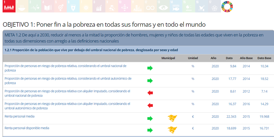Bistaratzea: Plataformak jomugei eta helburuei lotutako adierazleak erakusten ditu, joerari buruzko seinale batekin eta eskuragarri dagoen azken datu eta erreferentzia-urtearekin. Udaleko 43 adierazlek ikono propioa dute.